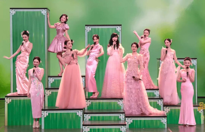 开场热舞之后,周慧敏、刘敏涛、梁咏琪、秦海璐、薛凯琪、张钧甯、姜妍、热依扎、刘惜君、希林娜依高,穿着粉色系衣服齐亮相,演唱歌曲《立春》。这几位美女往台上一站,扑面而来一股桃花香气,春天真的要来了!