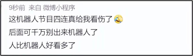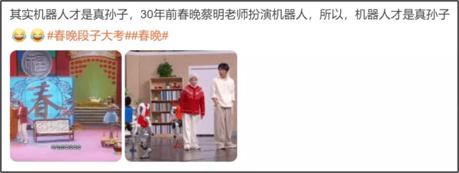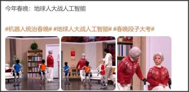 还有网友总结春晚机器人的出场画面,发现机器人领域每年都在进步,不过也有部分网友表示春晚机器人的含量有点高了,武术舞蹈都能干,引起部分网友焦虑。