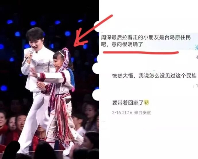 歌曲最后,周深牵起了台湾省高山族原住民——漂亮的小女孩的手,走向了其他五十多个民族孩子组成的大家庭。