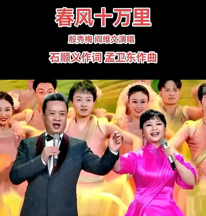 在这届央视春晚上,阎维文出尽了风头:一是他作为特邀嘉宾,与众多演员表演开场歌舞《欢乐吉祥年》;二是他与殷秀梅合唱《春风十万里》。
