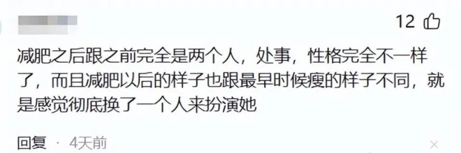 但减重带来的,远不止外形改变。?康复师分析指出,快速减重导致她胸廓内凹,背部肌肉力量失衡。?以前那个敞开胸怀、笑容极具亲和力的贾玲不见了。?现在的她,不自觉会有些“含胸”,连笑容都多了几分克制和疏离。?同剧组的雷佳音曾直言,瘦身后的贾玲像换了个人,得重新相处。 观众的感受更直接,很多人说:“瘦是瘦了,但感觉不好笑了。 ”