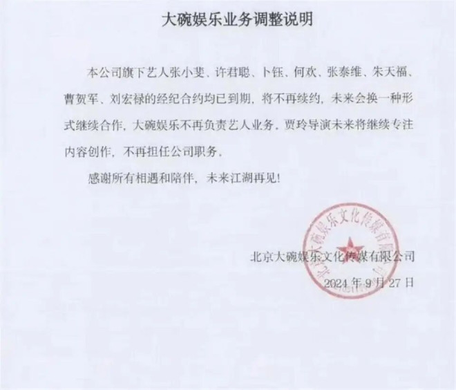 这种“距离感”也蔓延到了她的商业版图。 2024年9月27日,她一手创办的大碗娱乐发布公告,宣布重大业务调整。 旗下包括张小斐、许君聪在内的8位核心艺人,合约到期后全部不再续约。 贾玲本人也不再担任公司任何职务。 消息一出,外界猜测纷纷,是不是合伙人间闹掰了,或是资本套现离场。