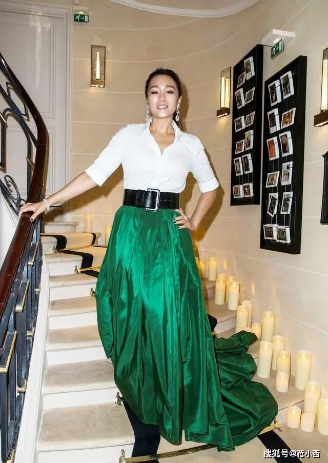 最惊艳的是那条祖母绿缎面半身裙,浓郁的绿色像一块流动的宝石,在灯光下泛着高级的光泽。缎面材质自带垂坠感,而巩俐用一条宽版黑色皮带,在腰身处狠狠一收,瞬间勾勒出纤细的腰线,凸显了优越的比例。