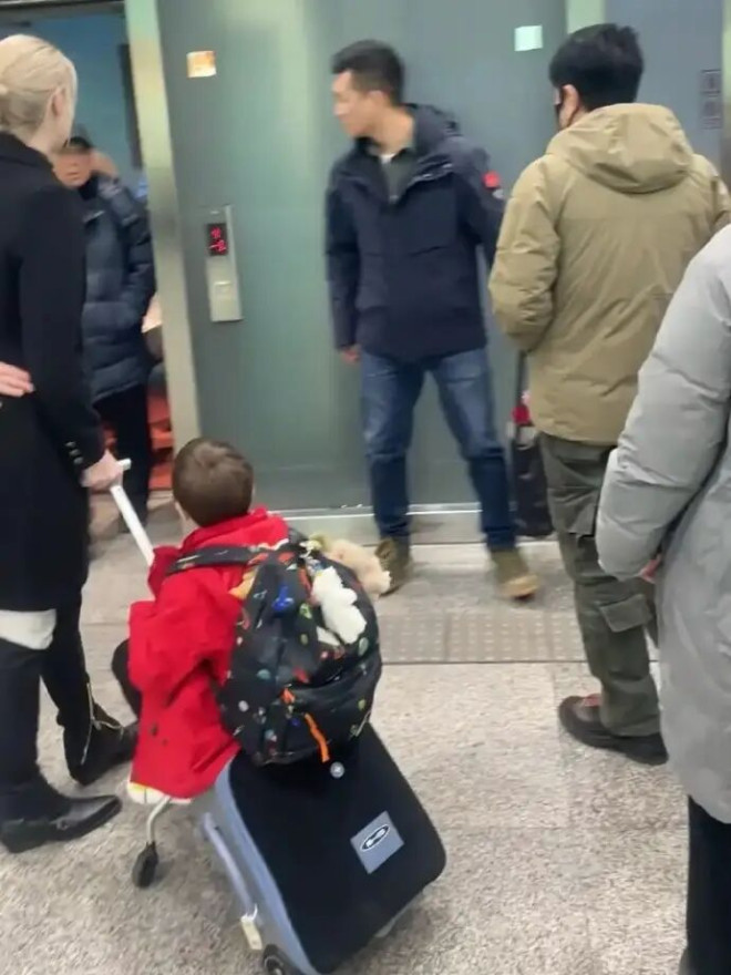 机场的另一焦点,无疑是妻子李白和两个可爱的孩子。李白一身黑色呢子大衣搭配高筒黑靴,身材高挑纤细,气质干练优雅,一双长腿十分抢镜。她全程照顾孩子,忙前忙后,尽显贤惠。