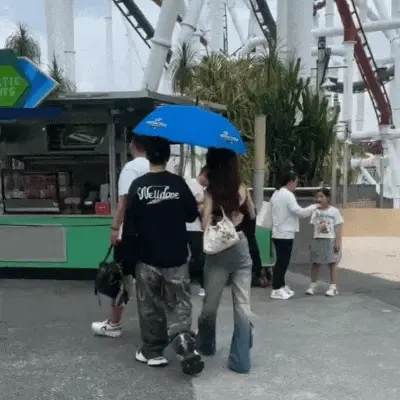 看互动,两人面对面的时候,黄晓明和美女正准备轮替接伞,黄晓明另一只手上还拿着饮料。