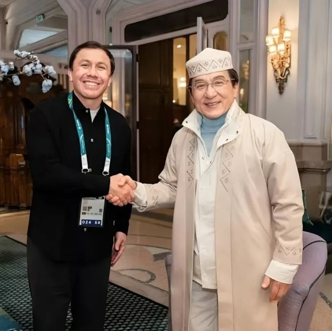 见对方要亲自帮他穿衣服,成龙也表现得非常配合,还一起合了影。