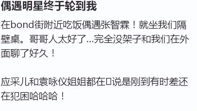 话说回来,这次在英国被偶遇到的张智霖,网友就夸他人非常好,完全没架子,张智霖用完餐还和粉丝们在外面聊了好久,比如问粉丝们在这边怎么样,安不安全之类的。