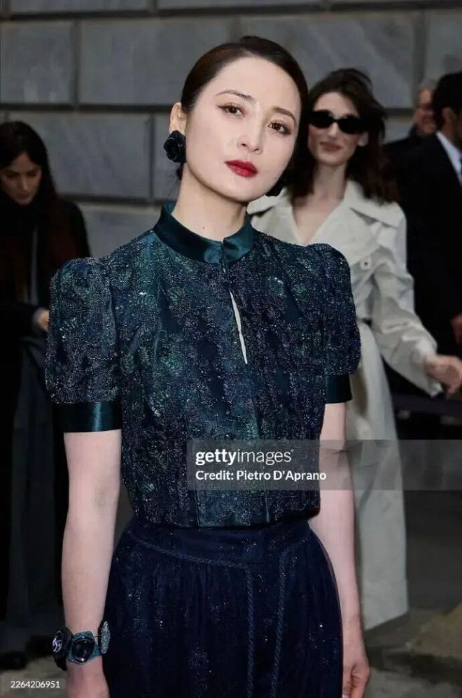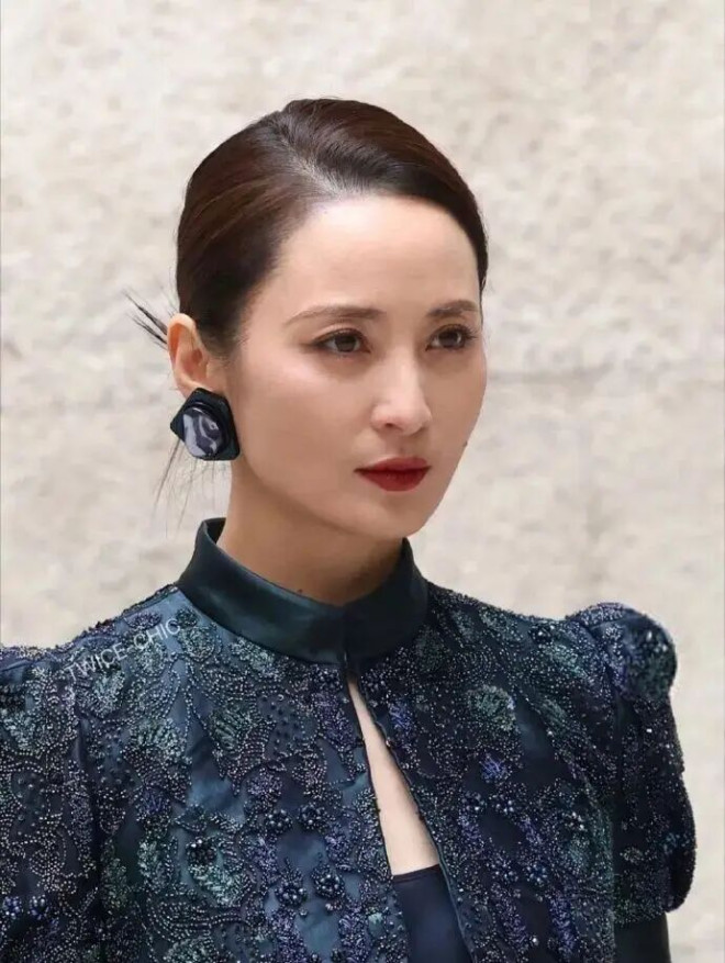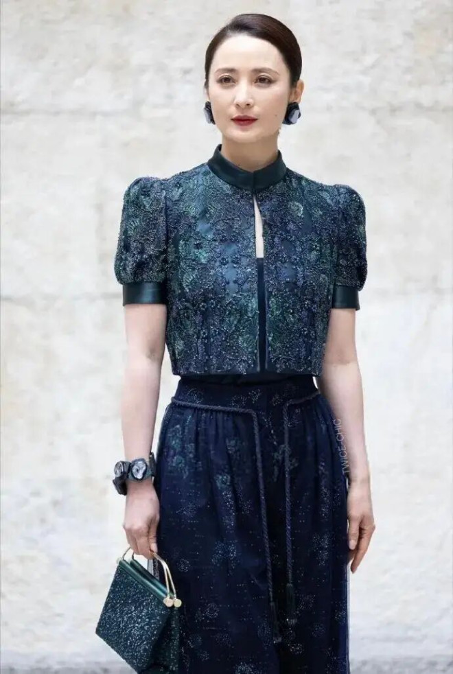 蒋勤勤身着Giorgio Armani蓝绿色手工刺绣套装,她利落盘发凸显流畅面部轮廓,颧骨与下颌线立体分明,360°无死角,堪称“骨相美天花板”。