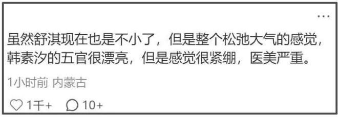 据悉,舒淇出生于1976年,韩素希则出生于1993年,两个人有着17岁的年龄差。可是,当两个人同框的时候,舒淇的状态明显更好。不管是从五官还是脸型角度看,舒淇的长相都比韩素希要大气,舒展的五官再配上她自在松弛的姿态,更显得一旁五官局促、一脸苦相的韩素希不像明星像路人。大家看到同框生图的时候直呼“舒淇赢麻了”。