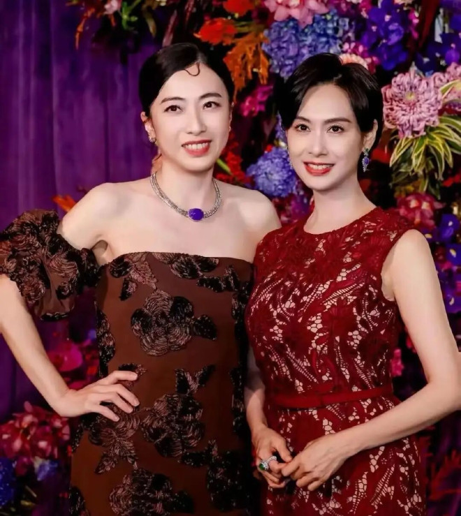 还有她和女明星朱茵的合影,脖子上的珠宝价值连城。