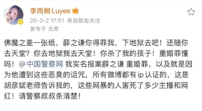 沉寂许久的李雨桐再次发难,开始通过互联网持续曝光薛之谦,并指控薛之谦犯重婚罪,艾特有关部门。