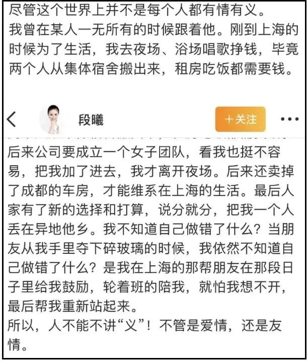 段曦自己也提到,她为了张杰卖掉成都的车子、房子,来到上海唱夜场,和张杰租房同居,换来的是单方面断崖式分手,差点就没撑过去。