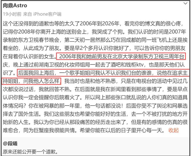 首先是前女友的爱,张杰前女友段曦发布长文控诉张杰出轨,曝光了二人交往细节,张杰否认了出轨,同时承认对过往感情心存尊重。