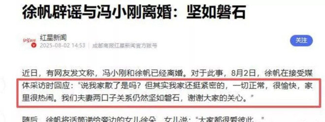 距离上次徐帆带着女儿出面辟谣婚变,才过去7个月。 那时候徐帆攥着徐朵的手,对着镜头笑着说“我们家坚如磐石” 。 可后来冯小刚清空社交平台里和徐帆的所有合照,又独自带着徐朵走芭莎红毯、见陈思诚密谈,身边始终不见妻子的身影 。 网友们的猜测就没停过:这两口子,到底还行不行?