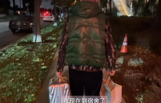 一手提着行李箱,一手拎着购物袋,站在宿舍门口久久不愿离去。
