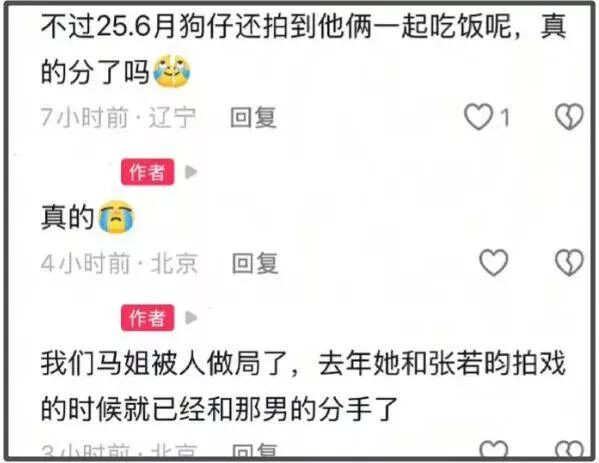 后来有粉丝爆料两人已经分手了,在马思纯重新出来拍戏的时候,就已经和张哲轩分手了,被狗仔拍到一起吃饭是被做局了。