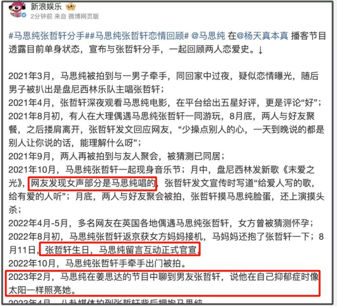 后续两人分手,马思纯差点一蹶不振,在那之后很少有作品出来。后来和张哲轩恋爱,更是被批“恋爱脑”,甚至传出怀孕的传闻。