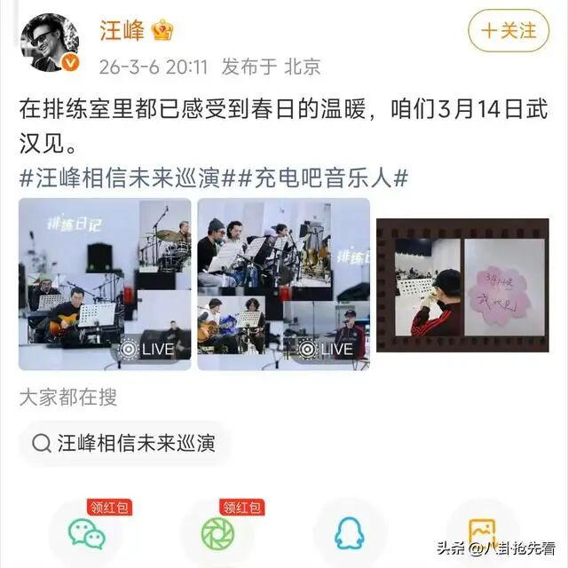 当时他也告诉粉丝,等到3月14日的时候,大家一起在武汉见,并且还给大家分享了一些他排练时的片段。