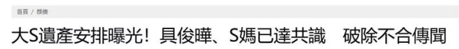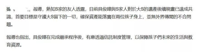 媒体:具俊晔希望最终的受益人是大S的子女,他说服S家人,全家保持理念一致,为孩子着想。