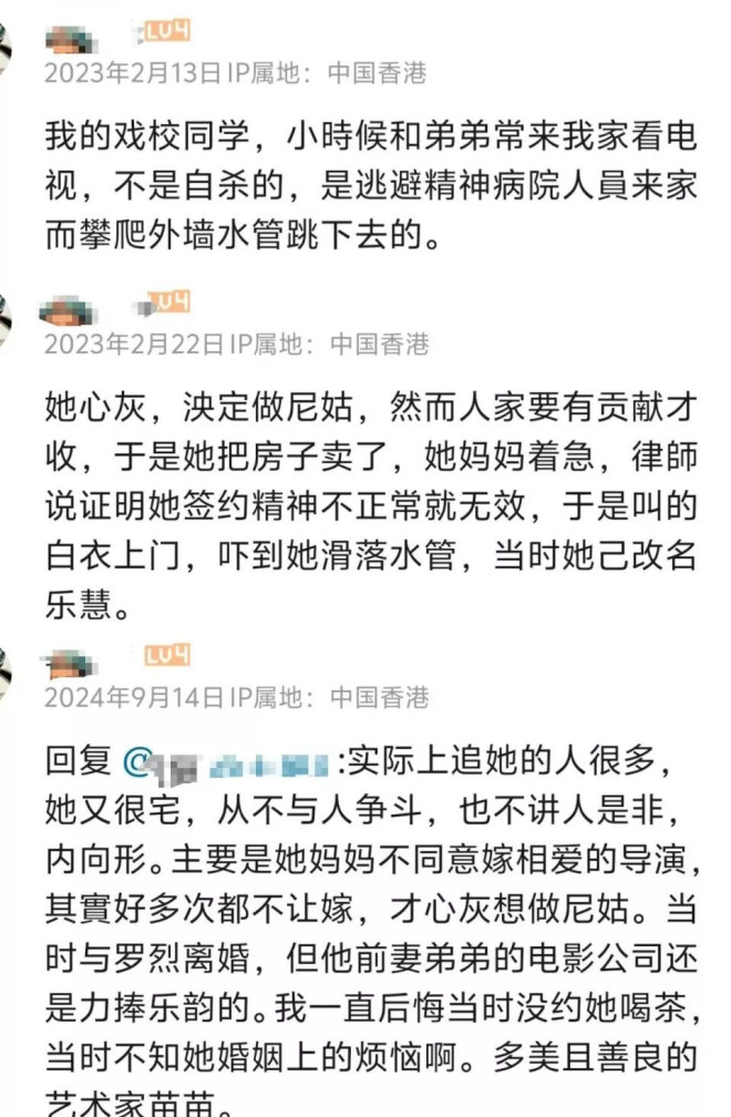 据该网友说,乐韵后来交往了一个导演但是她妈妈不同意他们结婚,乐韵心灰意冷要出家,出家之前想把房子卖了,她妈妈为了争取房子故意说她有精神病,并且通知精神病院的人上门,乐韵为了躲避他们攀爬到外墙水管,结果不慎跌落。