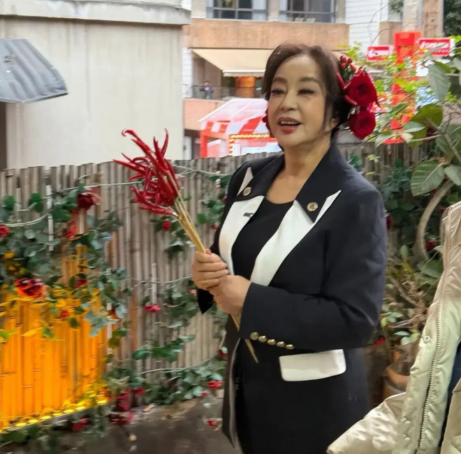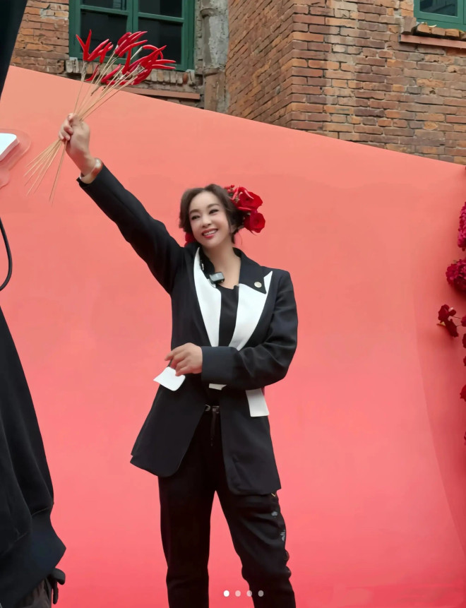 拍摄的时候,外面搭起了简易的背景板,其实就是在一块红色背景板前拍照,刘晓庆手里举着一束红辣椒,和头上的簪花色彩呼应,那么的热辣明艳。
