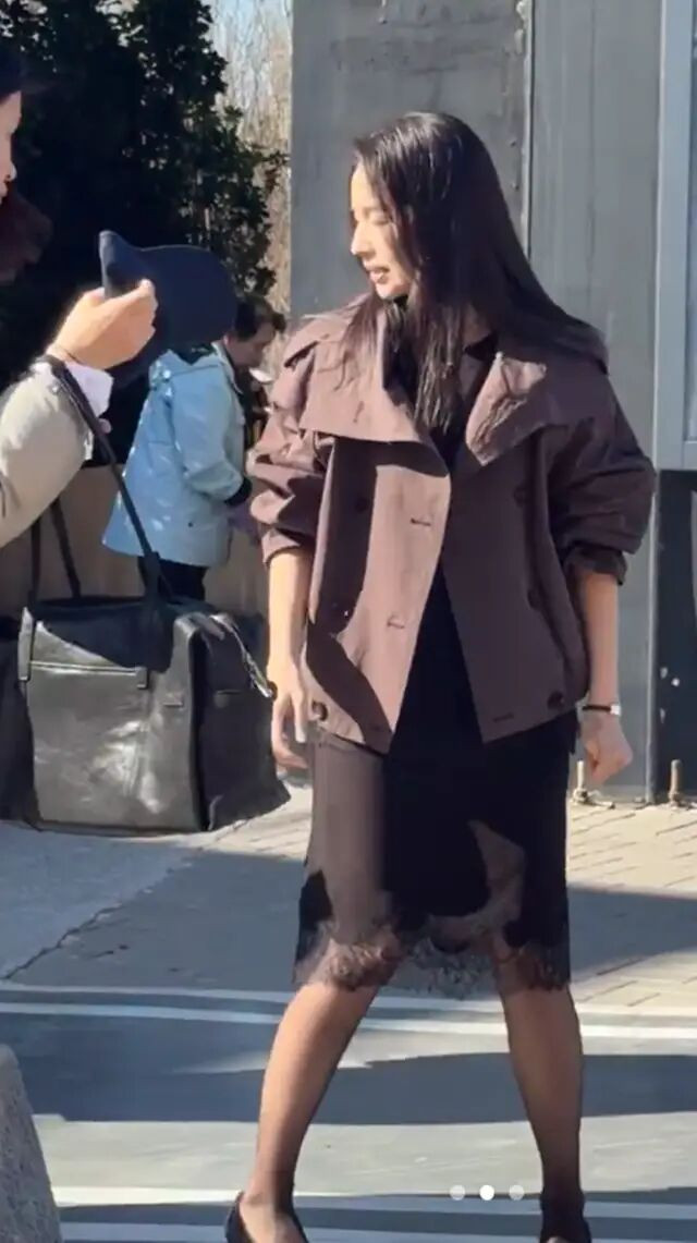 晒出的照片中,董洁换了两套造型,先来看看董洁的第一套造型,她身着一件深棕色短款风衣,内搭黑色连衣裙,裙摆带有蕾丝花边设计,整体造型简约中透着精致,展现出她一贯的优雅与知性。