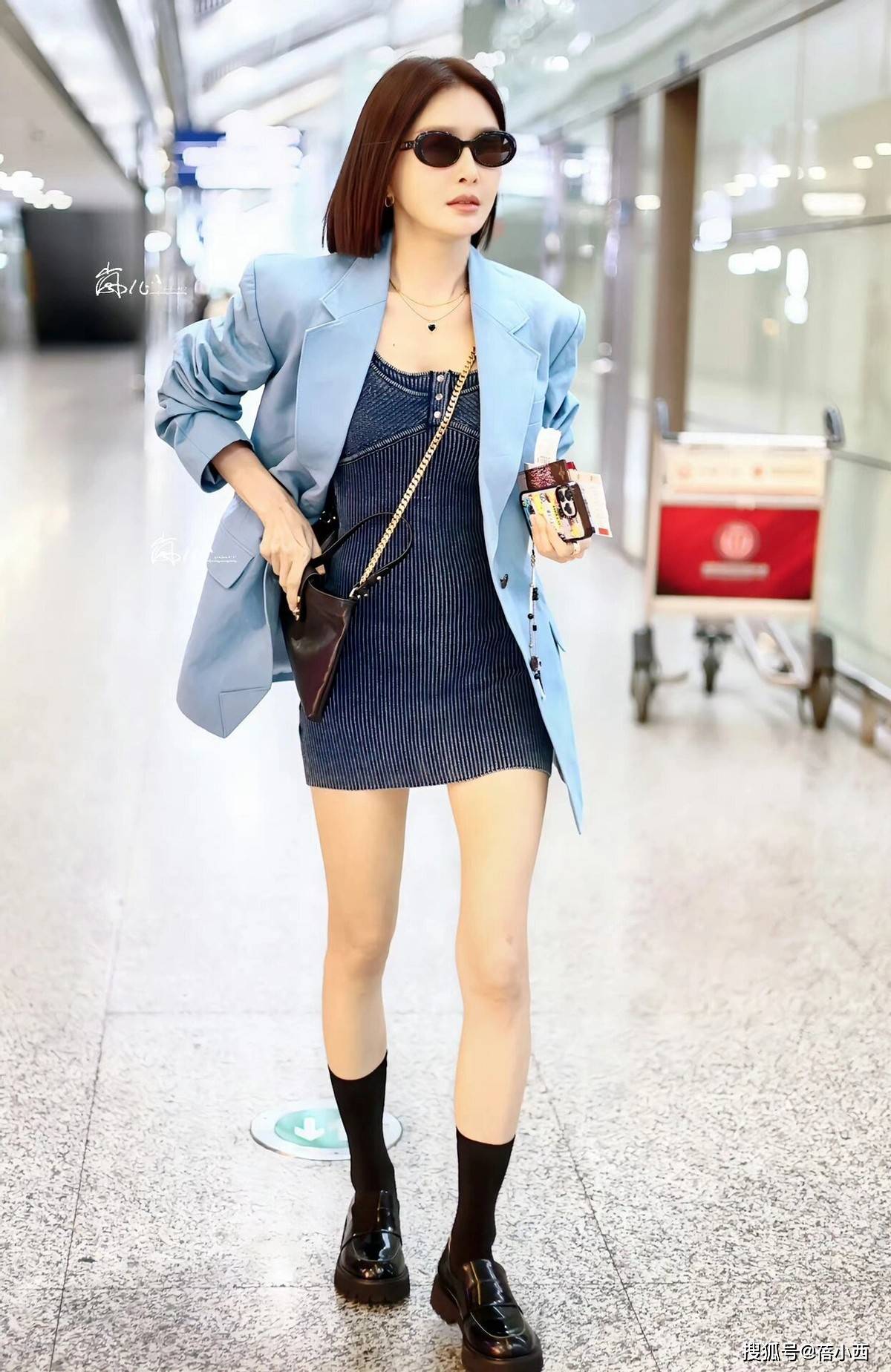 机场的西装+牛仔裙造型属于我们普通人日常可照搬的通勤穿搭,浅蓝色宽松西装外套自带清爽感,挺括版型有利于藏住拜拜肉与腰腹赘肉,对微胖身材格外友好,内搭藏蓝色竖条纹牛仔吊带连衣裙,短款设计刚好落在大腿中部,露出纤细腿部,竖条纹肌理还能纵向拉长身形,中和了西装的正式感。