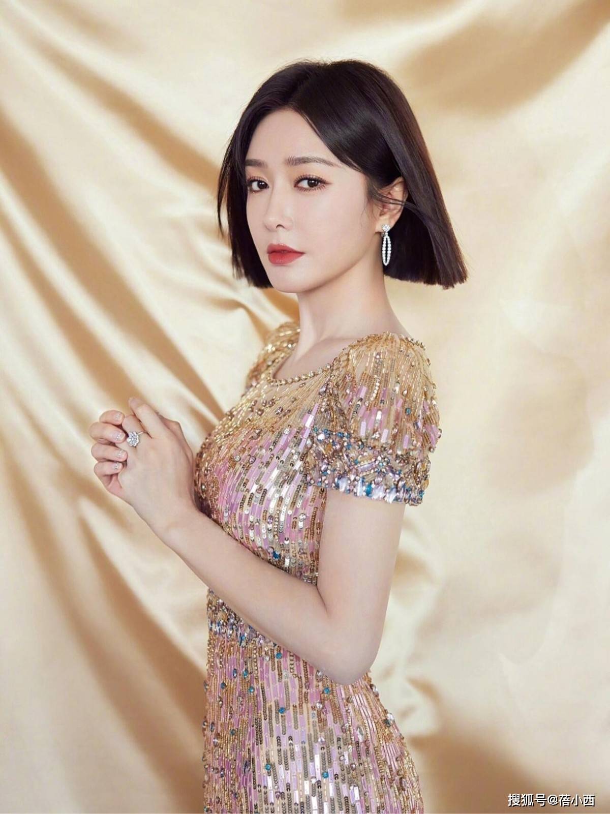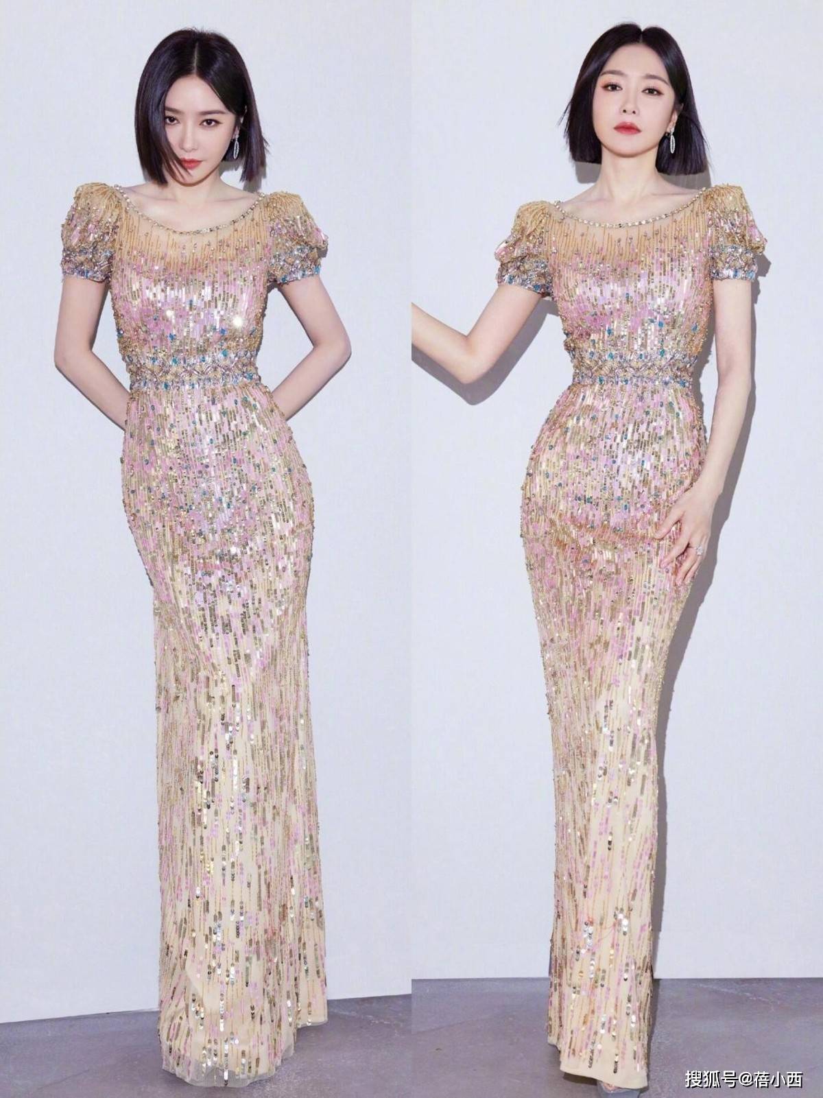 红毯上的亮片鱼尾连衣裙搭配则是她优雅气场的极致展现,粉金渐变的亮片裙自带流光质感,细密的亮片与珠饰交错,在灯光下折射出温柔光泽,完全不会显得浮夸。肩部的泡泡短袖设计增加了娇俏感,精致却不张扬。