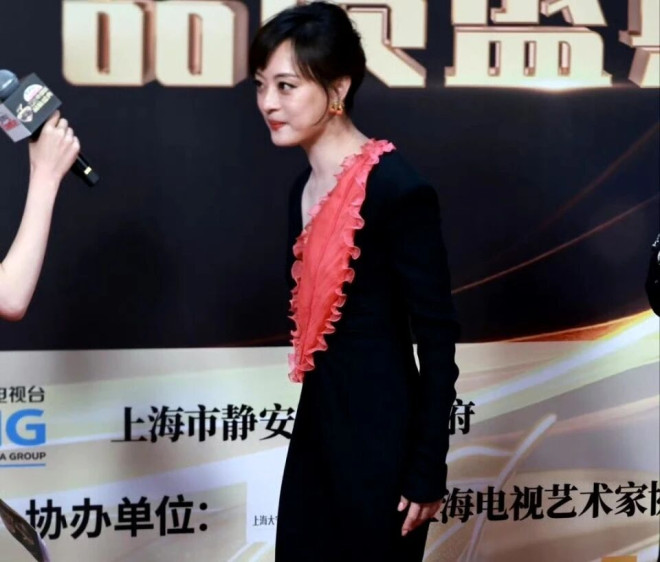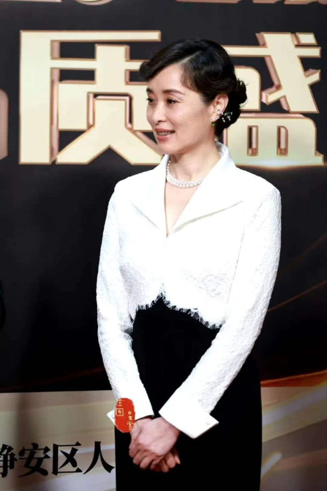 她身穿黑白拼色的礼服,搭配珍珠项链,侧分微卷短发像是低调又有内涵的高门贵女,举手投足间都带着几分淡淡的书香气。