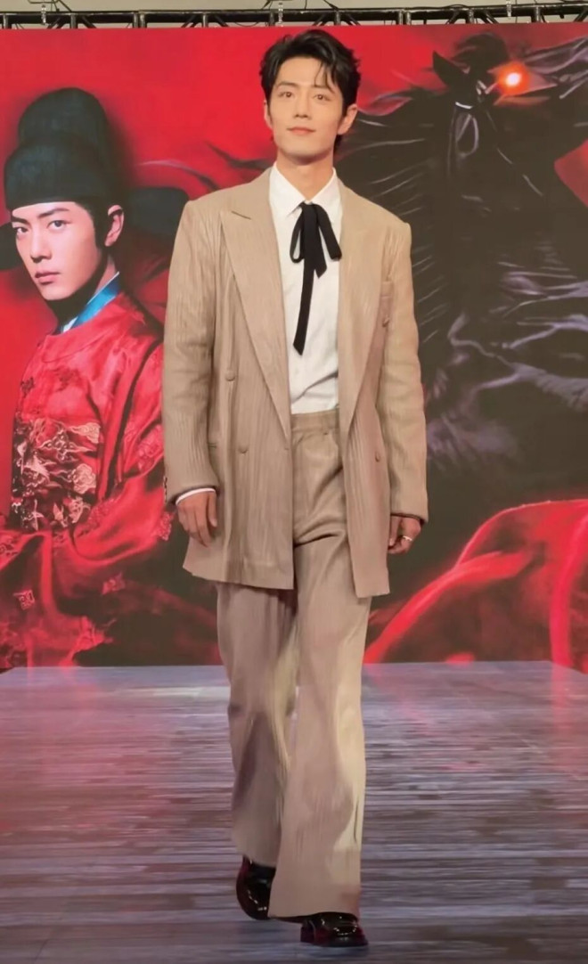 不过现场布置很高调,但肖战的穿搭风格并不张扬,浅咖色系套装配白色衬衣和黑色丝质领带,整个人散发着儒雅的少年气。