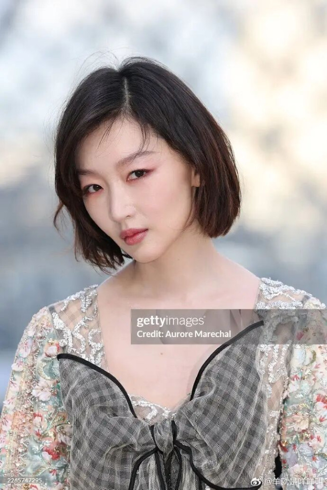 周冬雨身着银白亮片蕾丝透视长裙,胸前装饰黑色格纹蝴蝶结,短发造型凸显灵动感,风格融合甜酷与清冷。