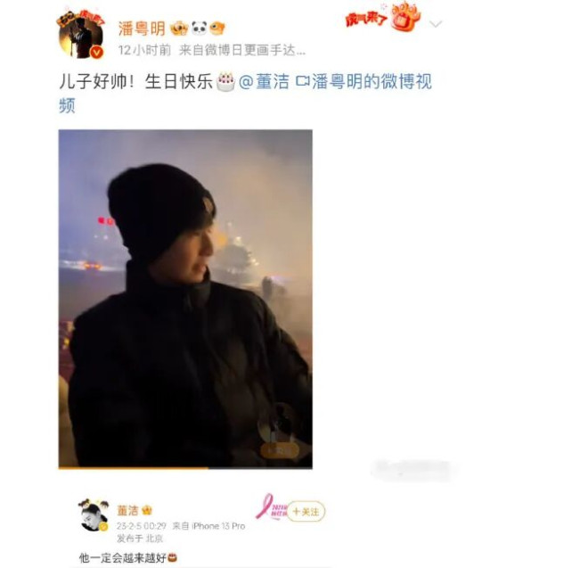 2023年2月5日顶顶14岁生日,潘粤明首次在微博发布父子放烟花视频并@董洁,董洁随即转发回应"他一定会越来越好"。