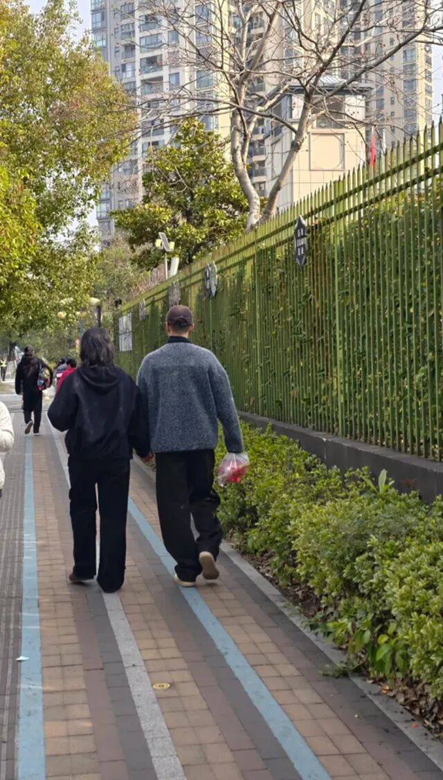 照片中,送完孩子的朱丹周一围正并肩走在铺有彩色砖块的人行道上,背影入镜的他们看起来亲密而放松。