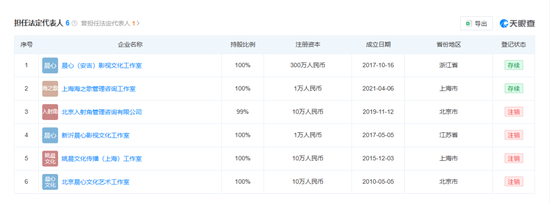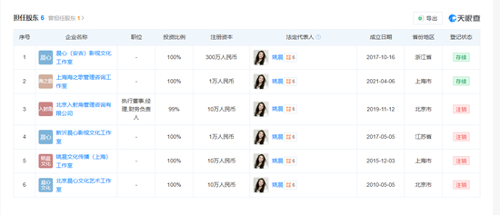 天眼查显示,姚晨名下关联6家企业,其中2家为存续状态,包括晨心(安吉)影视文化工作室、上海海之歌管理咨询工作室,涉及影视文化、管理咨询等领域,姚晨在上述企业担任执行董事、经理等职务。