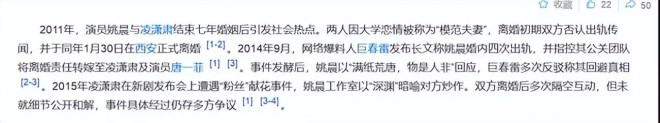 从百度百科可以看得出来,当年跟凌潇肃的离婚,姚晨把自己摘得干干净净,而凌潇肃,却成为那个跟唐一菲暧昧的,不折不扣的大渣男!