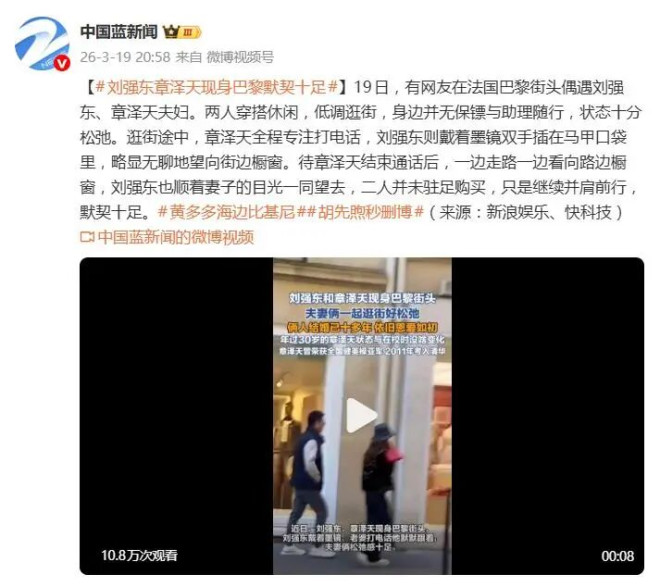 据3月19日报道,有网友在法国巴黎街头偶遇刘强东与章泽天夫妇。