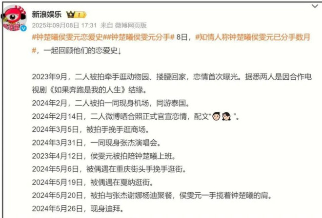 可好景不长,去年9月,钟楚曦那边悄默声地把官宣微博给删了,当时大家就猜分了 。 现在再看,侯雯元和钟楚曦2023年拍戏生情的时间线,跟姚晨拍《以美之名》的时间线,居然是重叠的 。