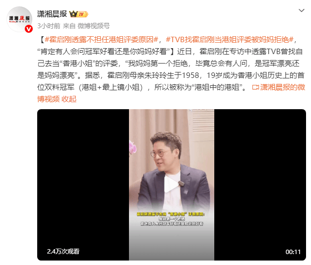 近日,霍启刚在专访中透露TVB曾找自己去当“香港、小姐”的评委,“我妈妈第一个拒绝,毕竟总会有人问,是冠军漂亮还是妈妈漂亮”。