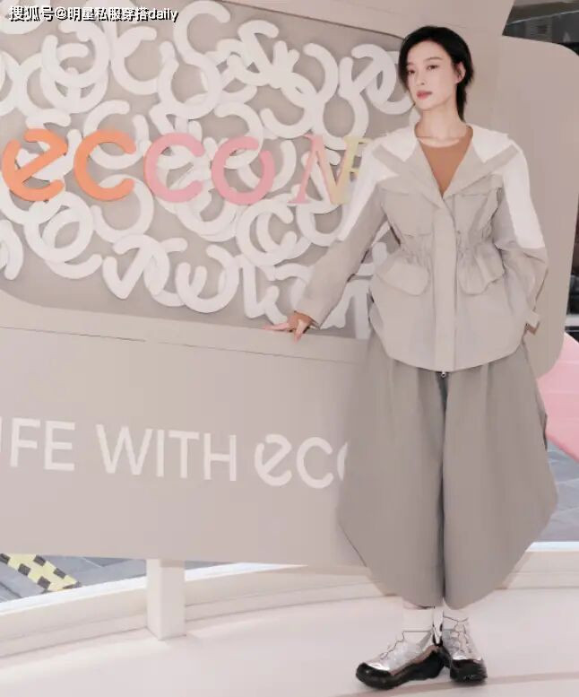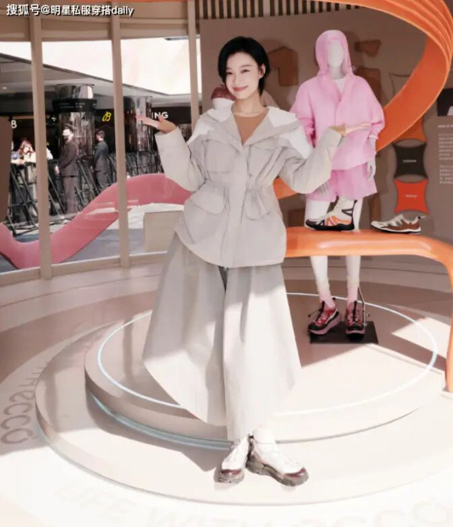 卡其色和米白色撞色设计的收腰短风衣搭配设计感十足的裤子,被她驾驭的也很文艺!加上这一头利落的短发造型,让她皮肤看起来白的发光!