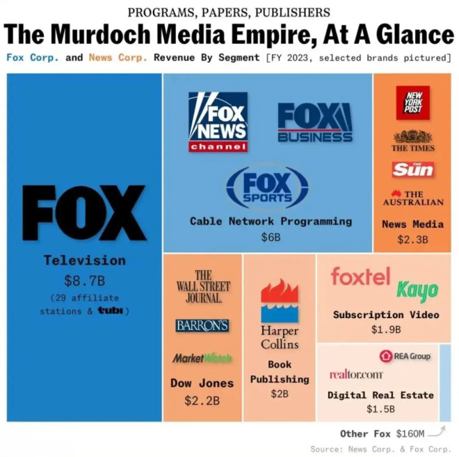 大家耳熟能详的福克斯、《泰晤士报》、《华尔街日报》、《纽约邮报》等都是他的产业👇