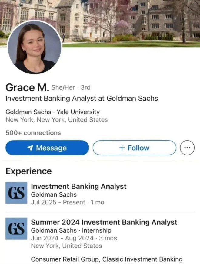 毕业后入职高盛(全球顶级投行)担任分析师👇