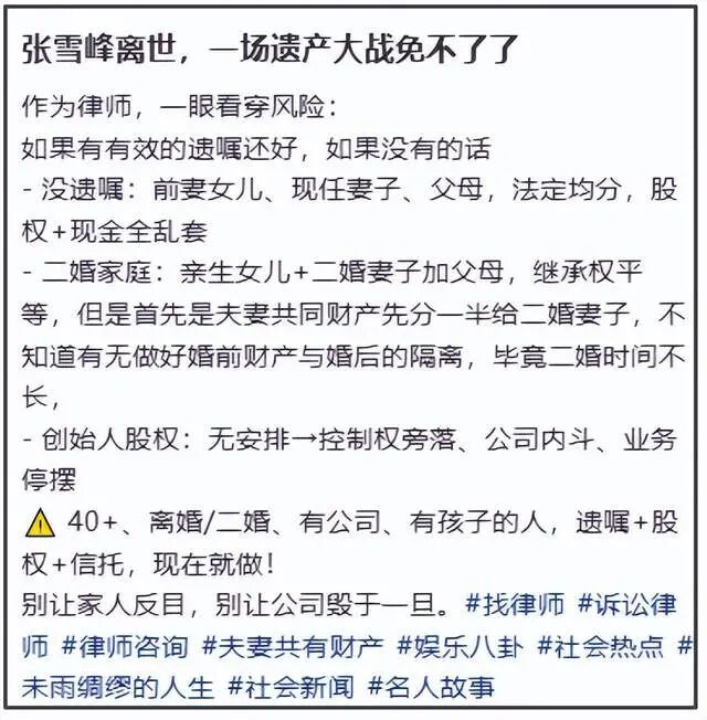 针对张雪峰遗产继承问题,有律师剖析了当下局面,归类两种情况,有遗嘱的话风险较低。若没有遗嘱安排且张雪峰再婚了,那亲生女儿、现任妻子、母亲恐会因为遗产问题乱套。按照继承法,张雪峰现任妻子将会先分得配偶一半财产,剩下的一半再分成三等份,分给现任妻子、亲生女儿、母亲,如此一来女儿只能继承到16.7%的财产,遗产大头则由后妈继承,有可能拿到66.7%。