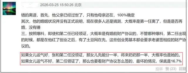 若按照爆料再婚时间不满一年的话,张雪峰现任妻子能不能拿到夫妻共同财产的一半也引发了争议,有网友指出张雪峰这种大佬再婚很有可能会提前签订婚前协议,只是这婚前协议只针对还在世的人,很可能无效。