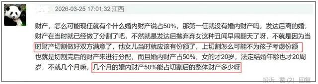 夫妻共同财产指的是婚后收入,有网友认为张雪峰和第一任妻子离婚时间发生在2020年,当时张雪峰已经走红,身价不菲,很有可能当时就已经做好了财产切割,给女儿留了足够的份额。至于现任妻子,网传年龄刚满20岁且结婚不满一年,能切割到的婚后财产有限。