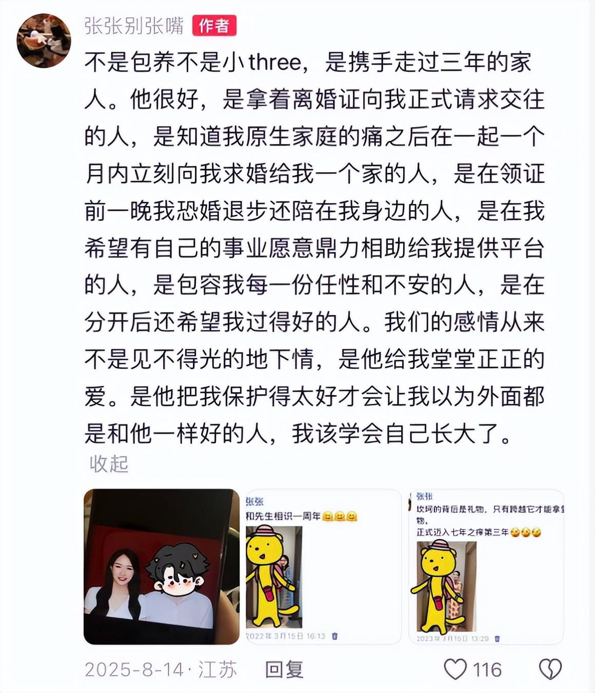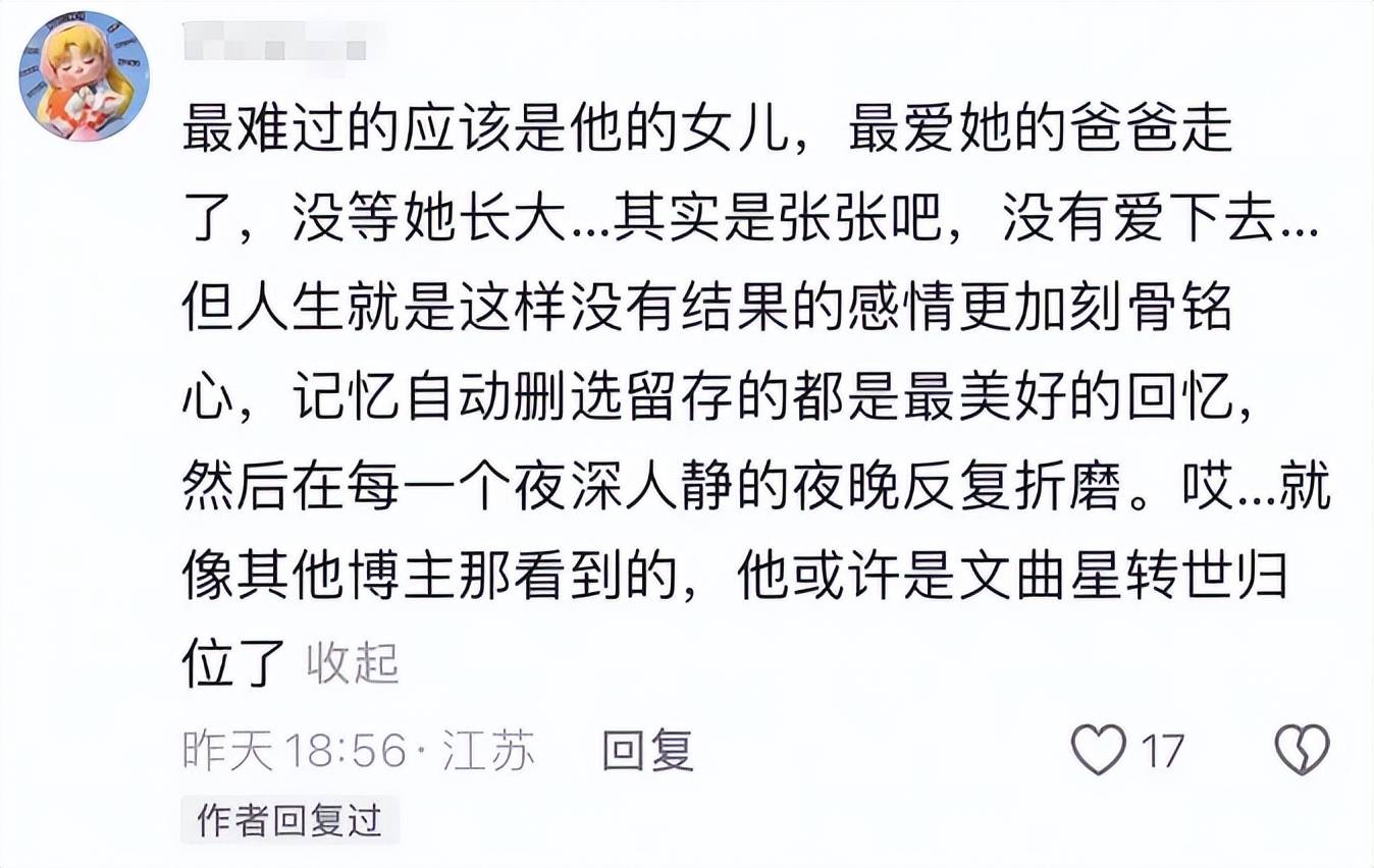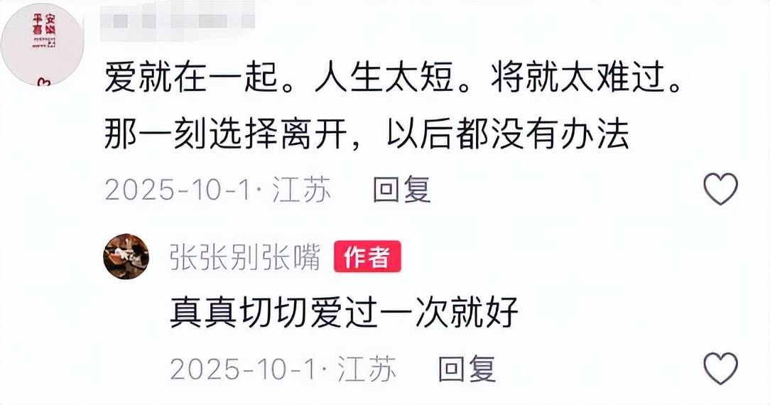 当时有网友希望两人能后期复合,张张的回复里无疑也留着念想,提到“如果有缘,自会让爱重逢”。