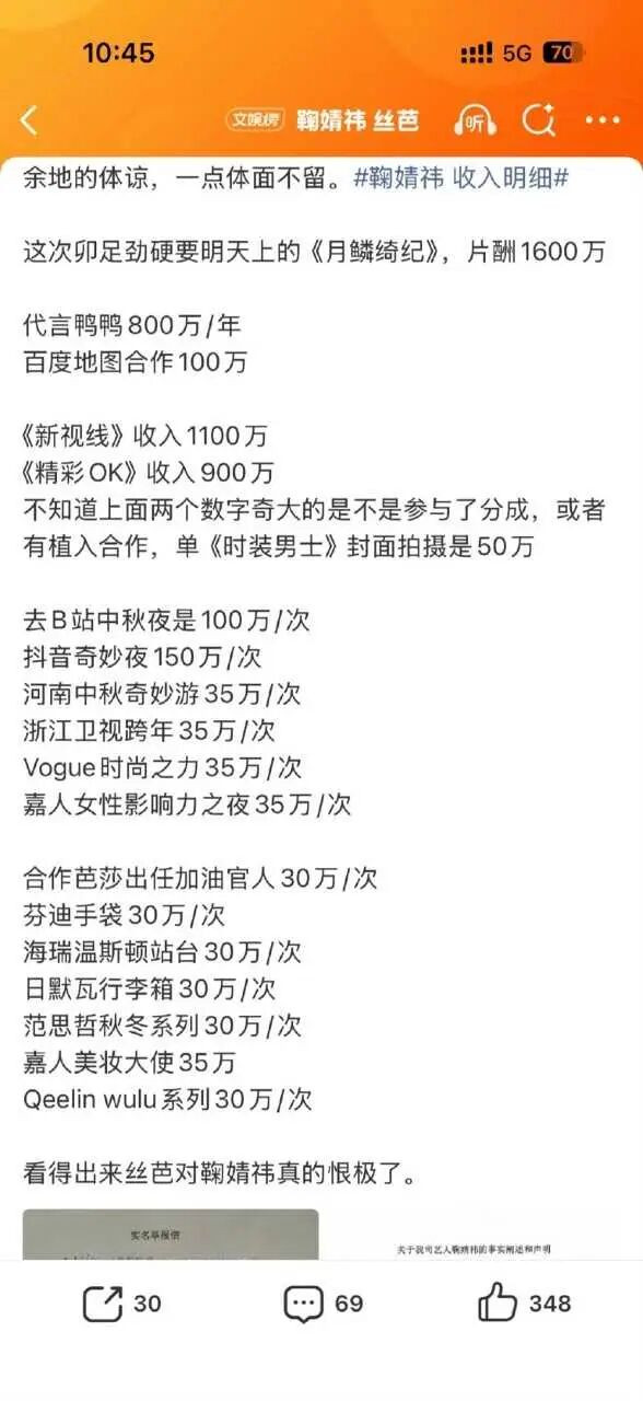 网传明细显示,其收入主要分为四大板块:影视演艺类以剧集片酬为核心,仅《月鳞绮纪》便斩获1600万元片酬;商务合作与代言类包含各类商业合作、品牌推广及年度品牌代言,合计收入超两千万元。