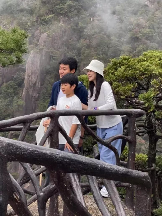 儿子佟俊言身穿白色t恤,打扮简单清爽。一家三口在景区拍合影留念,同框画面温馨有爱。