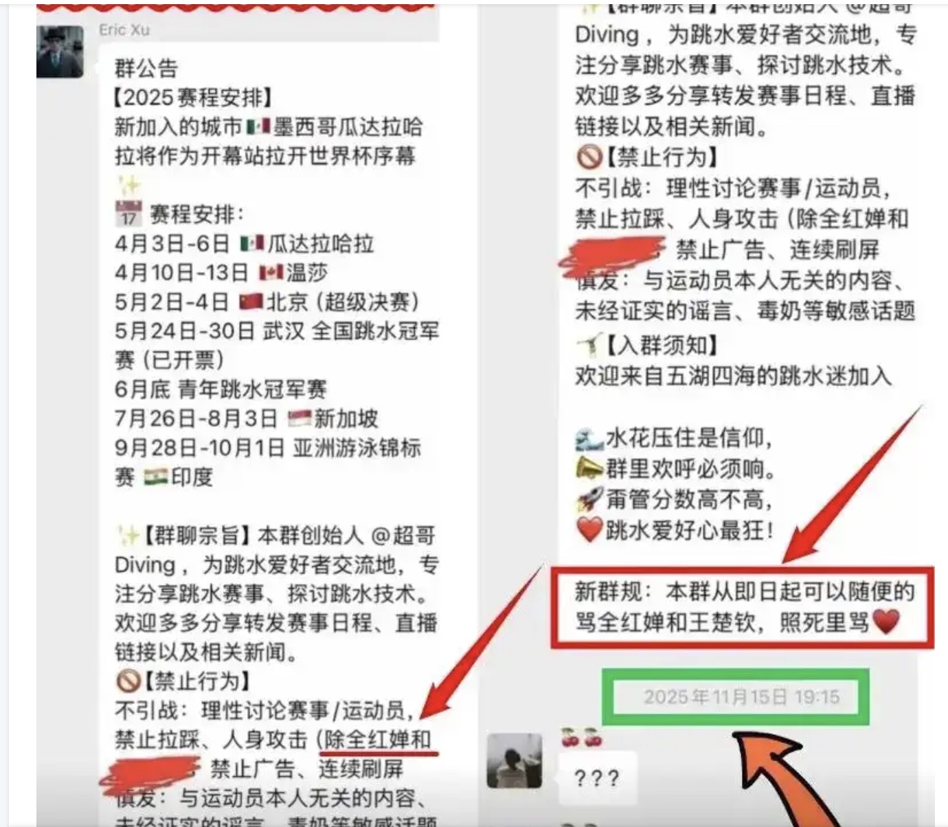 据网传信息,该微信群名为“水花征服者联盟”(282人),群里多人长期针对全红婵进行人身攻击,对全红婵使用大量侮辱性外号,其中,群主在群公告中明确标注“禁止攻击其他运动员(全红婵、除外)”,在2025年11月15日,该群还设置了“新群规”,明确说,“本群即日起可以随意的骂全红婵和王楚钦,照死里骂”。