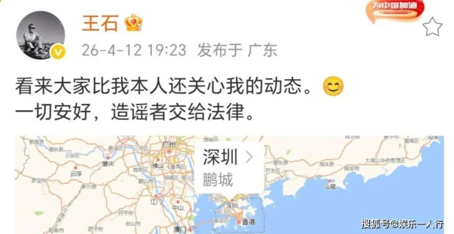 最先打破沉默的是王石的妻子田朴珺。她在晚上7点08分发了条微博,语气直接:“这是法治社会,造谣是不需要付出代价的吗?”十五分钟后,王石本人的回应来了。晚上7点23分,他更新了微博,配文带着点调侃:“看来大家比我本人还关心我的动态。一切安好,造谣者交给法律。”微博下方显示的地址是“广东”,更具体一点,是“深圳”。