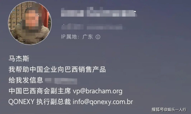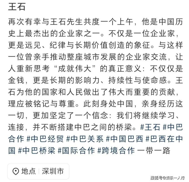就在同一天,另一位博主的社交账号更新了。他写道:“再次有幸与王石先生共度一个上午”,并称赞王石是杰出的企业家。这位博主的认证信息显示,他是中国巴西商会副主席、QONEXY执行副总裁,IP地址也在广东。